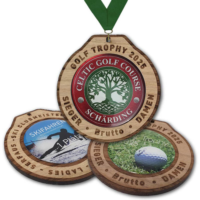 Diese Holzmedaille aus nachhaltigem 3,5 mm starkem Vollholz aus Österreich können Sie nach Ihren Wünschen ganz individuell gestalten: 4-farbiger Druck in der Größe von 45 mm Durchmesser kombiniert mit Lasergravur am äußeren Rand der Holzmedaille.