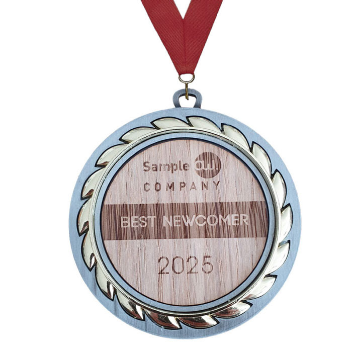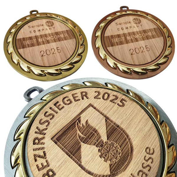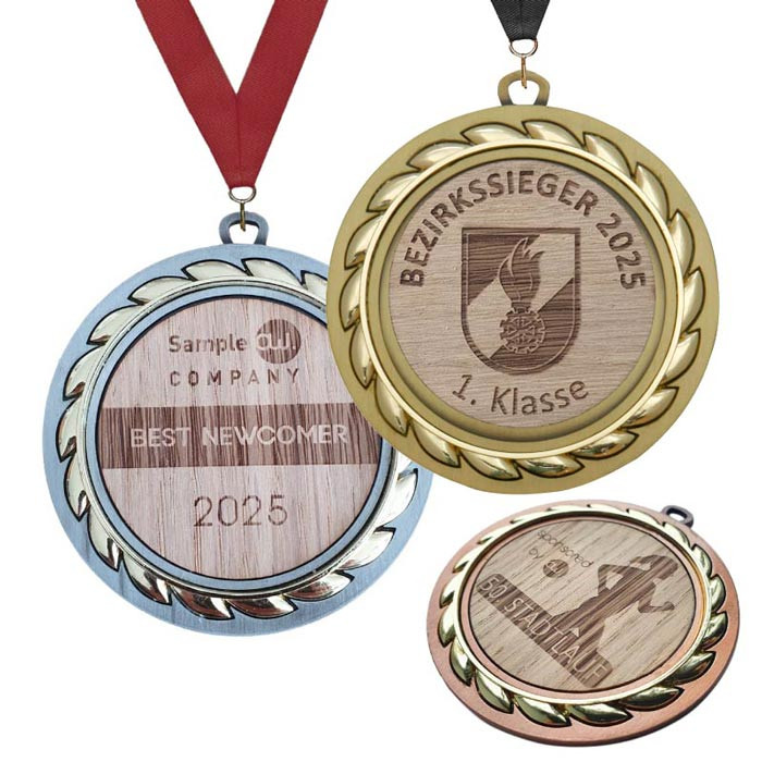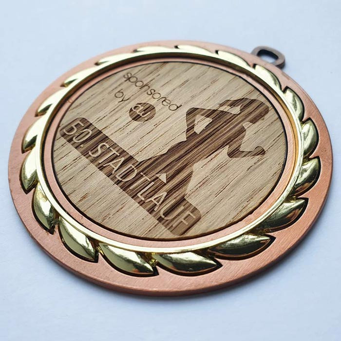 Medaille Marie ist eine Kombination aus Holz und Aluminium. Die Medaille ist mit ihren matten und glänzenden Elementen sehr wertig. In Kombination mit einem Eichenholz Emblem wird diese Medaille zum begehrten Highlight Ihrer Veranstaltung.