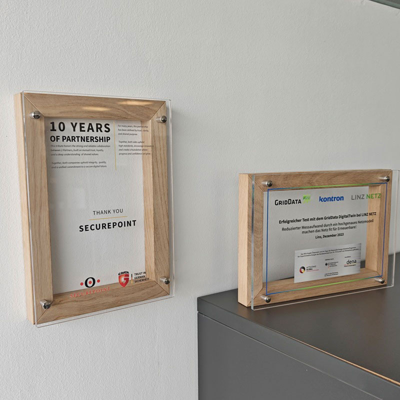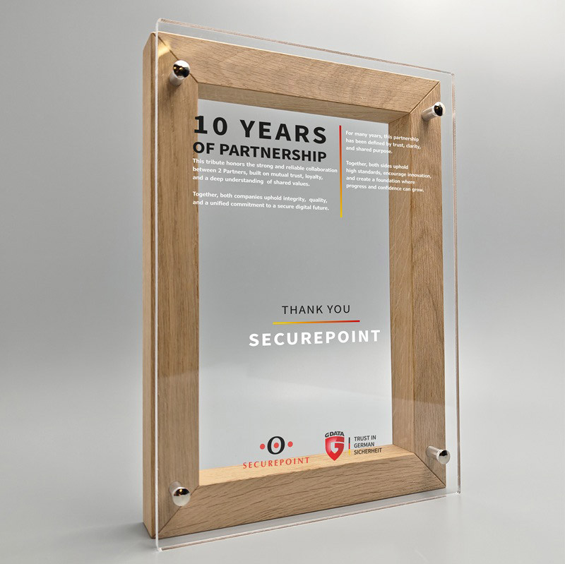 Eine moderne Auszeichnung freistehend oder zum aufhängen. Kann sowohl im Hoch- als auch im Querformat verwendet werden. Fertig montiert mit 1cm Abstandshaltern zwischen Rahmen und Platte. Auf der Holzrückseite sind 4 Lochungen an den Ecken zum aufhängen. Schutzverpackt mit Folie im Karton geliefert.